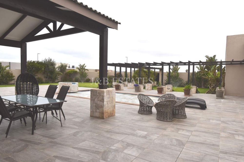 A PEACEFUL PATIO WITH WITH OUTDOOR BBQ OVERLOOKING A SPARKLING POOL