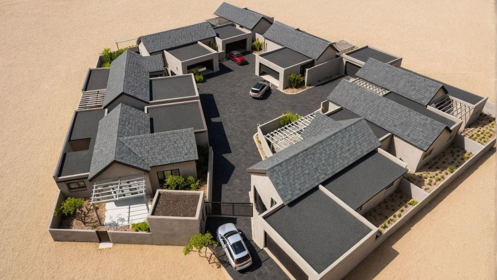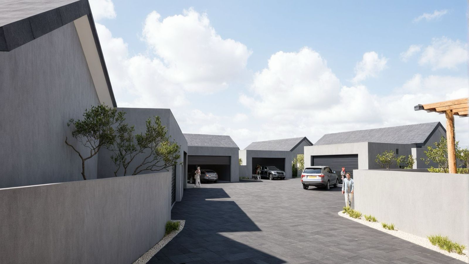Secure gated complex with private gardens and paved driveways.